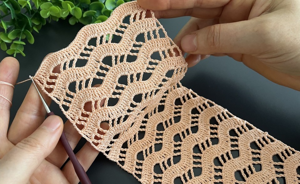 This design is a wave / ripple lace stitch made with double crochets and chain spaces.