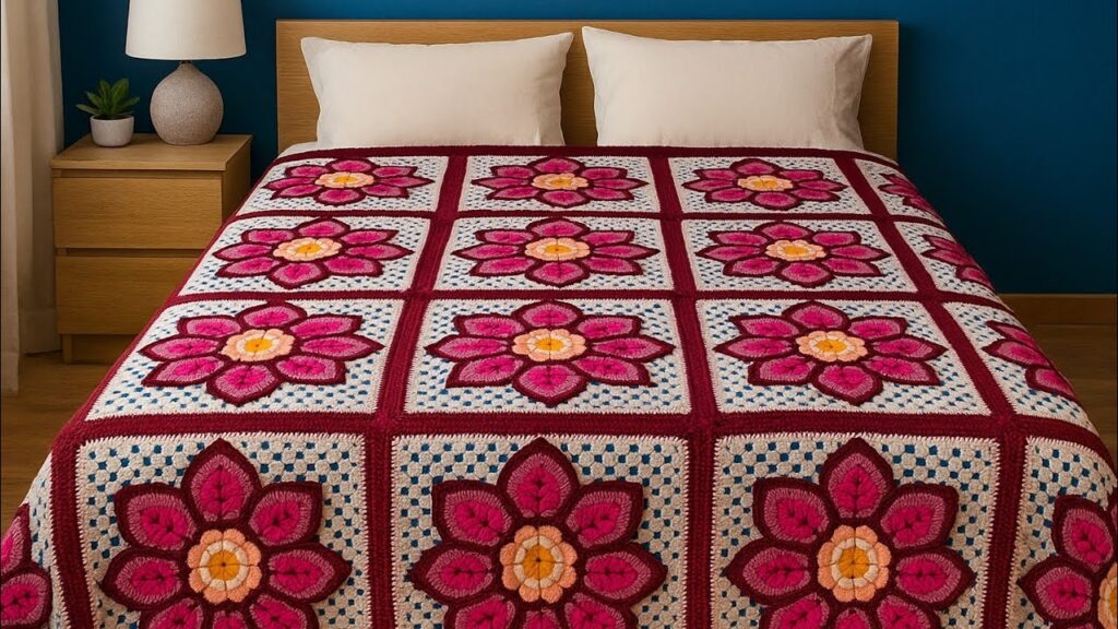 Here is a full, clear pattern for the large 8-petal flower granny square blanket