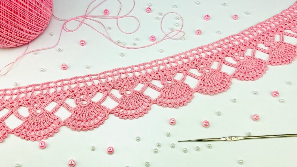 This crochet fan lace tape (also called “crochet lace strip” or “doily tape lace”). It’s worked in one continuous strip, creating repeating oval motifs with fan shapes that join together as you go.