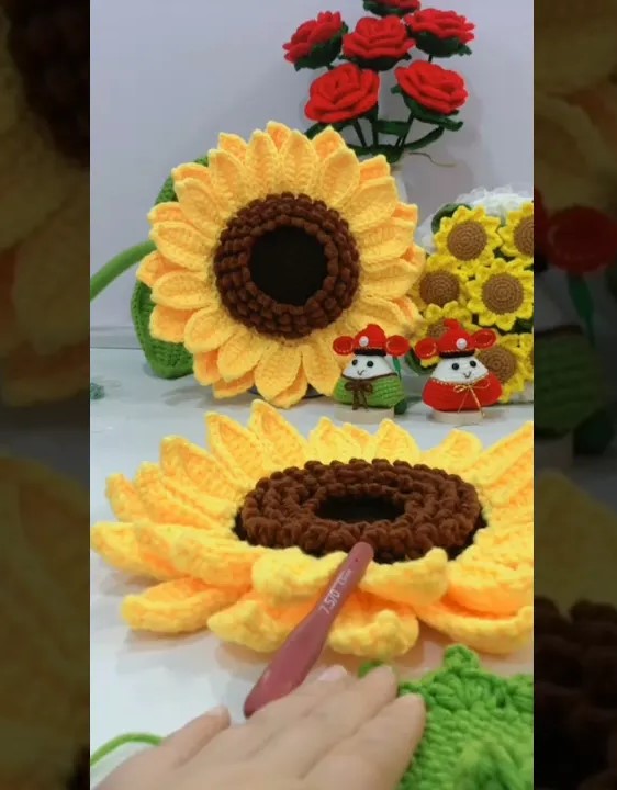 Ohh, beautiful choice 🌻! What you’re looking at is a crochet sunflower with layered petals and a textured puff-stitch center. This type of crochet flower is often used as decoration, in pillows, wall hangings, or even big bouquets.